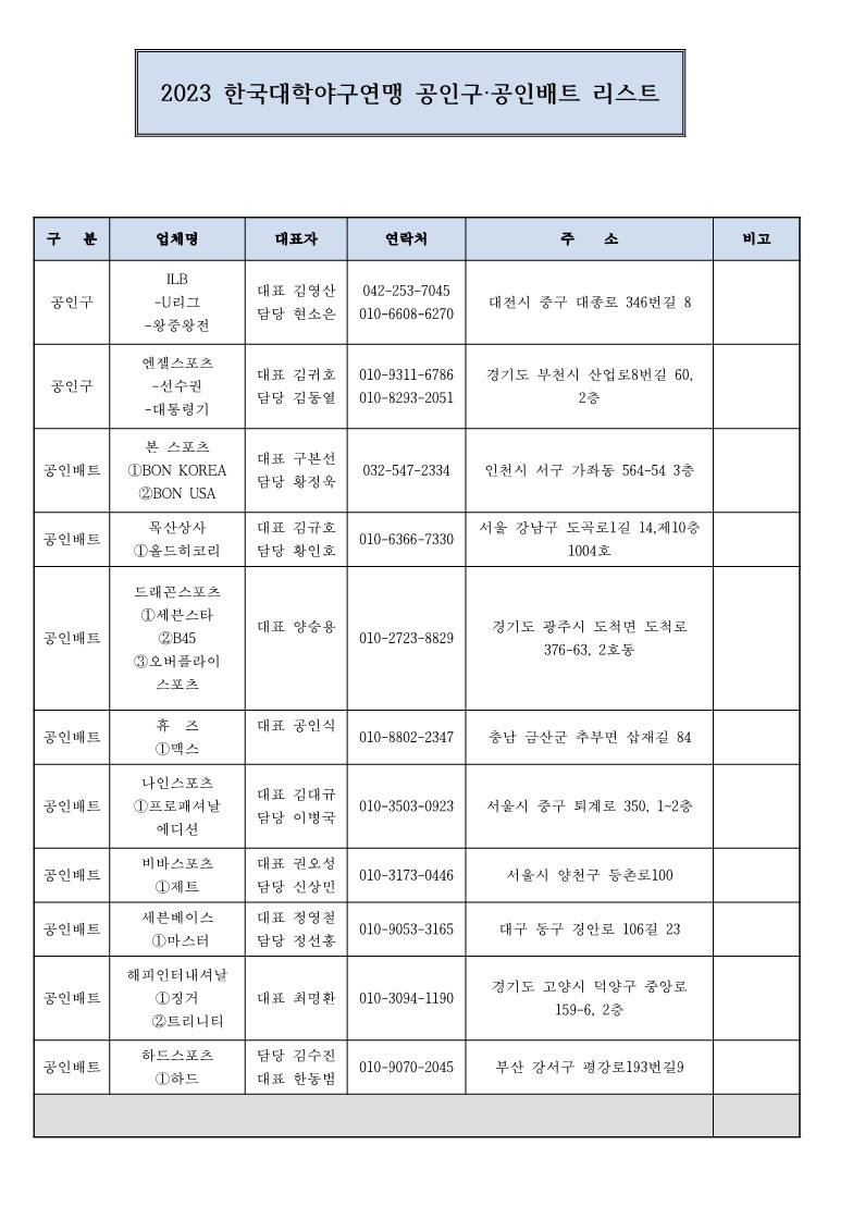 2023년 공인구, 배트 리스트 페이지 정보 작성자 한국대학야구연맹 댓글 0건 조회 2,529회 작성일 23-04-11 14:35 목록 본문 안녕하세요, 한국대학야구연맹입니다.공인구 배트 목록 입니다.참고하시기 바랍니다! 이전글2023 대학야구 U-리그 경기 일정 변경 안내 23.04.23 다음글2023 정기대의원총회 및 대표자회의 개최안내 23.04.11 댓글 0 댓글목록 등록된 댓글이 없습니다.