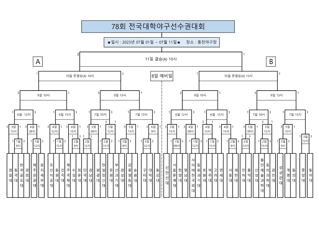 공지사항 제 78회 전국대학야구선수권 대회 대진표 페이지 정보 작성자 한국대학야구연맹 댓글 0건 조회 6,604회 작성일 23-06-08 10:42 목록 본문 첨부파일로도 다운로드 하실 수 있습니다. 첨부파일 78회 전국대학야구선수권 대회 대진표.pdf (177.4K) 288회 다운로드 | DATE : 2023-06-08 10:44:49 제78회 전국대학야구선수권 대회 규정.pdf (79.4K) 58회 다운로드 | DATE : 2023-06-20 18:16:38 이전글제 57회 대통령기 전국대학야구대회 대진표 23.06.08 다음글6월 8일 A조 홍천 경기 일정 변경 안내 23.05.31 댓글 0 댓글목록 등록된 댓글이 없습니다.